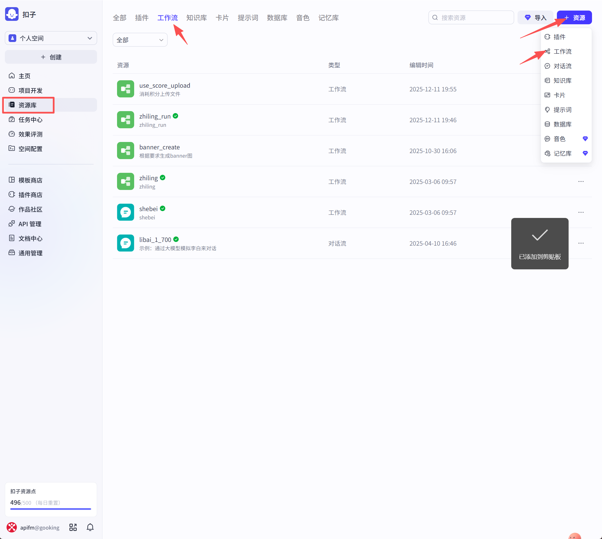 另外一个分支就是扣除积分成功了,接下来进行另外一个分支的流程,调用上传文件的接口实现文件上传,选择插件,搜索 `apifm oss`: