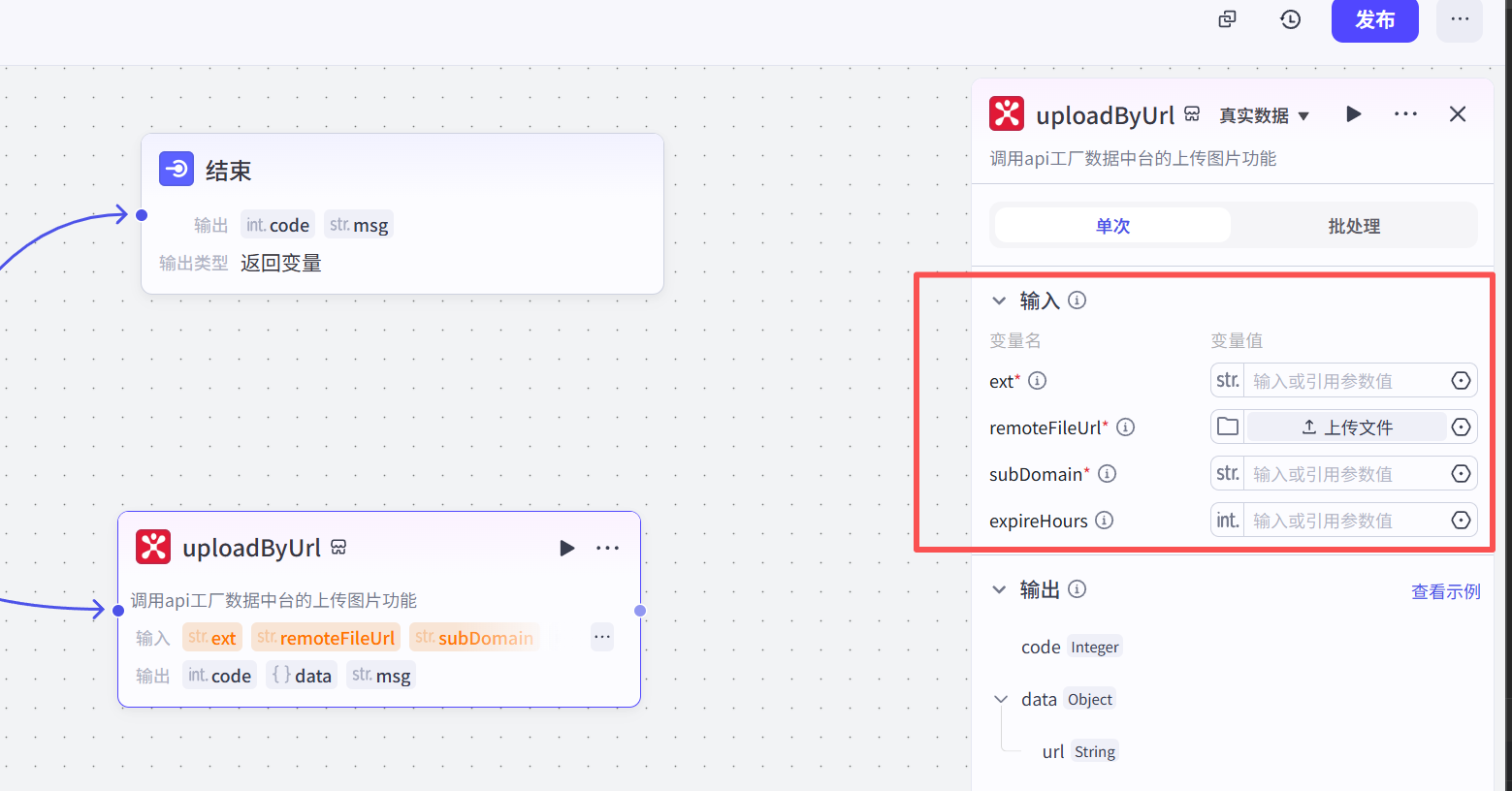 按照上面的工作流,如果执行成功,code 返回 0 ,msg 返回 success ,url 会返回上传的文件链接地址;如果执行失败,code返回 非0 的数字,msg 返回具体的错误信息