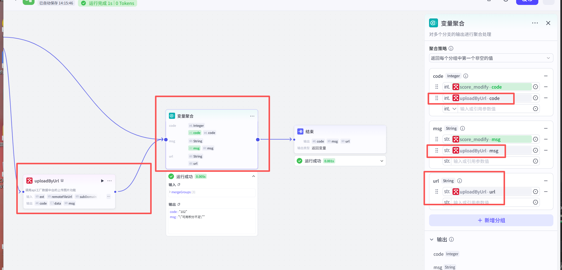 下面根据积分扣除是否成功,进行不同的业务处理。因为有成功和失败2种情况,所以输出的结果有2种情况,所以这个时候,需要使用 “变量聚合”节点,把2种情况的数据聚合后返回: